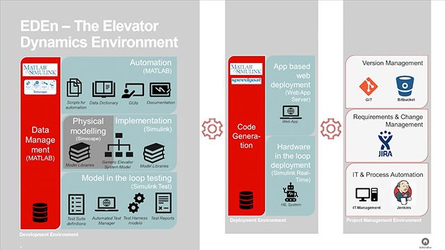 Schindler Elevator is now introducing a model-based validation workflow into its development process. The EDEn (Elevator Dynamics Environment) is a set of tools developed in MATLAB®, Simulink®, and Simscape™ to perform offline simulations using web-based applications as well as hardware-in-the-loop tests. With EDEn, software release testing is shortened from three or four weeks to one overnight run, greatly reducing cost and risk while enabling much broader test coverage.
