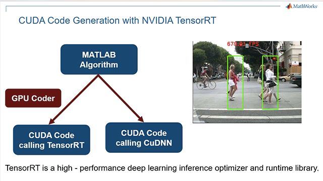 GPU Coder generates optimized CUDA® code from MATLAB code for deep learning, embedded vision, and autonomous systems. The generated code can be compiled and executed on NVIDIA®GPUs. Generated CUDA code calls optimized NVIDIA CUDA libraries including cuDNN, cuSolver, and cuBLAS.