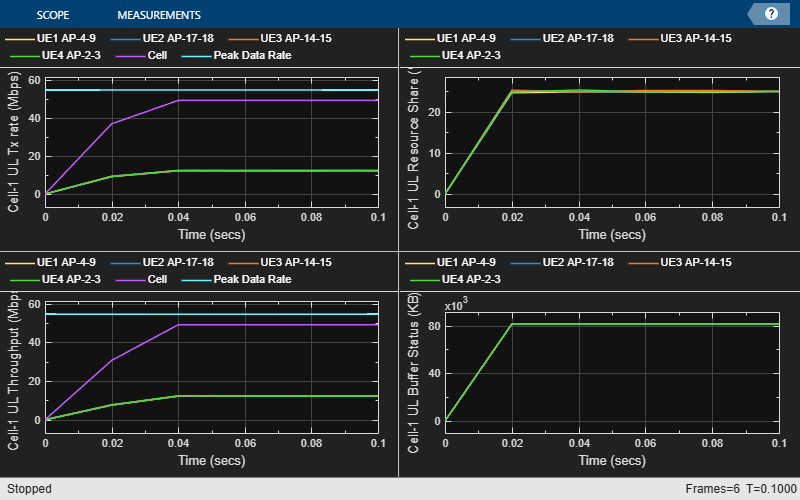 Peak UL throughput: 54.64 Mbps Achieved cell UL throughput: 45.48 Mbps Achieved UL throughput for each UE: [11.31 11.38 11.42 11.36] Peak UL spectral efficiency: 2.73 bits/s/Hz Achieved UL spectral efficiency for cell: 2.27 bits/s/Hz Block error rate for each UE in the UL direction: [0 0 0 0] Peak DL throughput: 75.37 Mbps Achieved cell DL throughput: 66.25 Mbps Achieved DL throughput for each UE: [16.37 16.73 16.54 16.61] Peak DL spectral efficiency: 3.77 bits/s/Hz Achieved DL spectral efficiency for cell: 3.31 bits/s/Hz Block error rate for each UE in the DL direction: [0 0 0 0]
