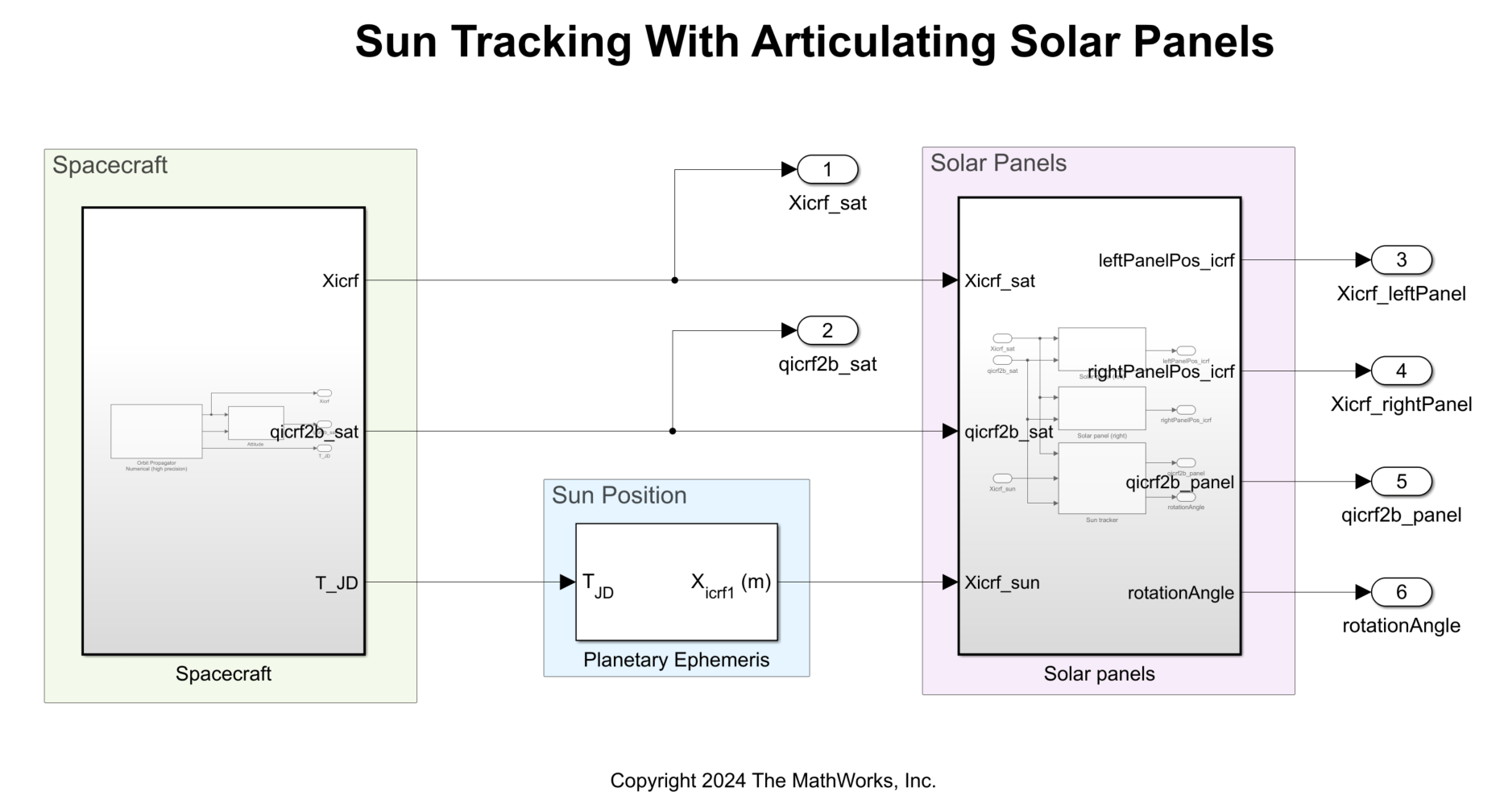 Open the Simulink model to simulate a nadir pointing spacecraft with articulating solar panels tracking the Sun.