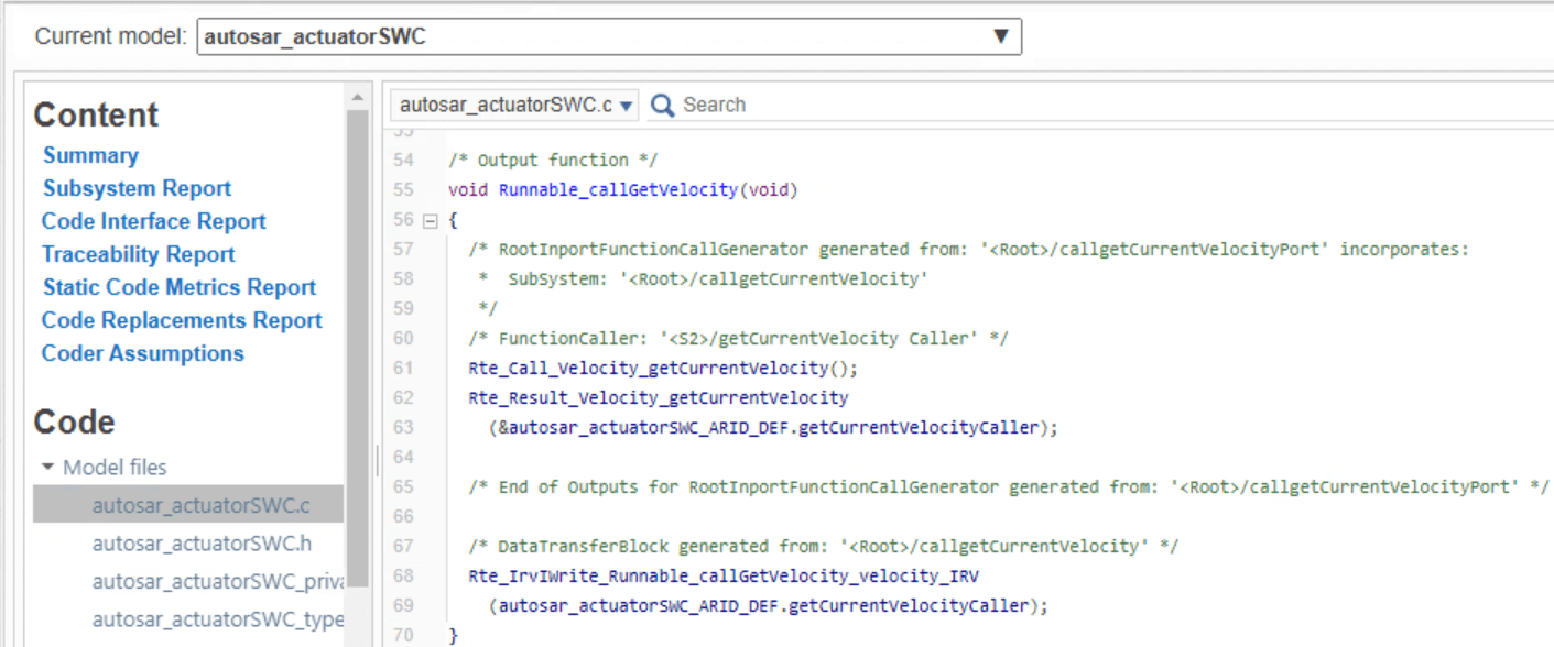 In the architecture export report, you can navigate to code generated for each of the component models. For example, to view code for the model autosar_actuatorSWC, select it from the Current model list.