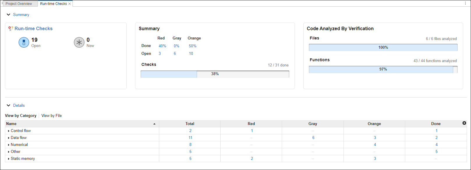 The Code Analyzed By Verification card displays the number of file and functions and the percentage that were successfully analyzed as a result of the Code Prover analysis.