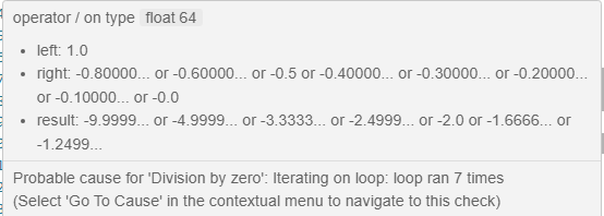 • The probable root cause for division by zero, if indicated in the tooltip.