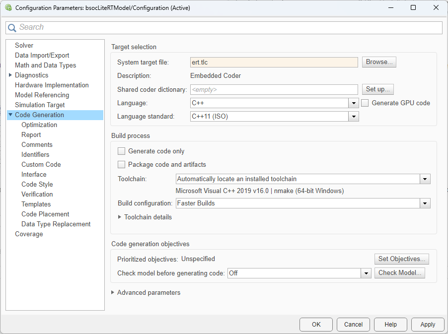 To run the model on a Raspberry Pi board, in the Simulink Toolstrip, click Model Settings to open the Configuration Parameters dialog box. In the Code Generation pane, set System target file to the ert.tlc.