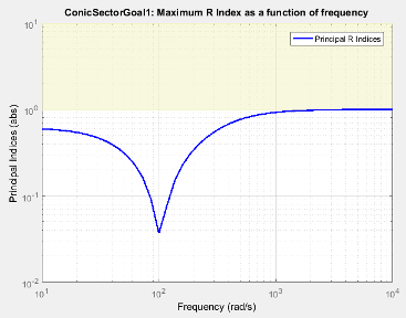 is satisfied at all frequencies if and only if the R-index is less than one. The plot that Control System Tuner displays for Conic Sector Goal shows the R-index value as a function of frequency (see sectorplot).