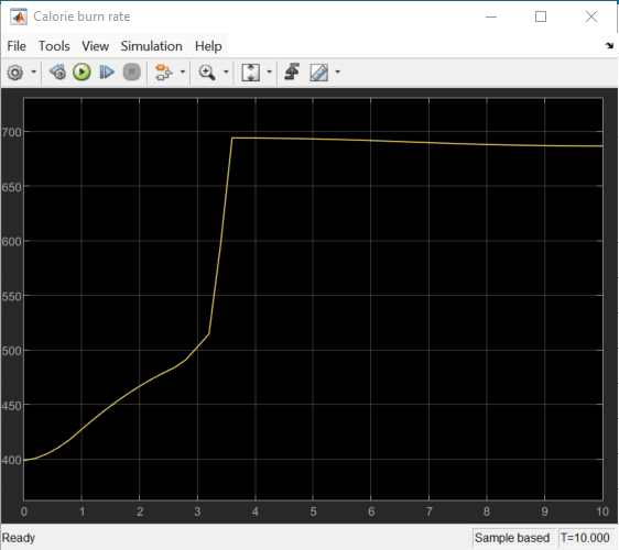 The Scope block shows the calorie burn rate over time. To experiment with the Simulink model, adjust the weight and sensor sources and run the simulation again.