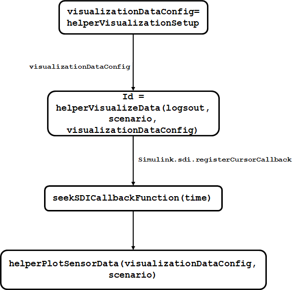 The helperVisualizeData function initializes SDI, and adds the seekSDICallbackFunction function as the SDI cursor callback function. The callback function takes the data from logsout and adds it to the structure at each cursor move. The callback function passes this structure to the helperPlotSensorData function, which enables you to visualize sensor data in playback mode.