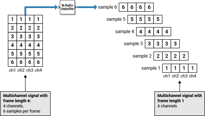 Use the N-Ratio Unbuffer block to unbuffer multichannel signals of frame length N into multichannel signals of frame length 1, where N is a positive integer greater than 1.