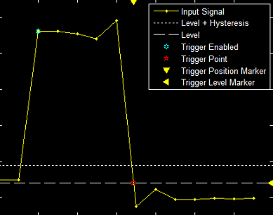 Run the simulation. Triangle trigger pointers indicate the trigger time and trigger level of an event. The marker color corresponds to the color of the source signal.