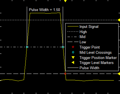 Note A glitch trigger is a special type of a pulse-width-trigger. A glitch trigger occurs for a pulse or spike whose duration is less than a specified amount. You can implement a glitch trigger by using a pulse-width-trigger and setting the Max Width (s) parameter to a lower value. Level Settings — Select the level settings for a pulse-width signal.