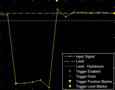 Alternatively, a trigger event can occur when the signal stays within the boundaries defined by the hysteresis for 7.50 seconds after the signal crosses the threshold.
