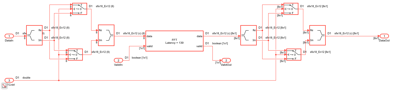 The model operates on complex data and uses a streaming interface with control signals to indicate when the data is valid. The system processes 8 samples per cycle and implements a 512-point FFT/IFFT.