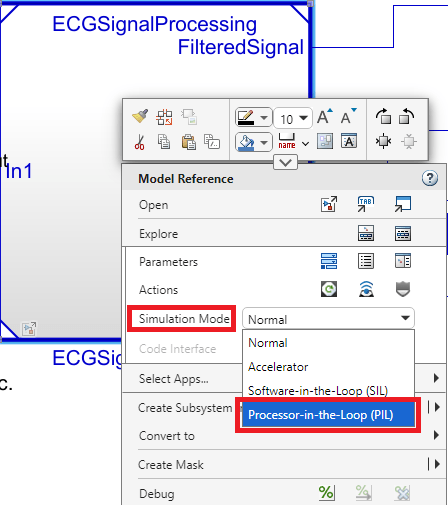 2. Set the Referenced Model Simulation Mode to "Processor-in-the-Loop (PIL)"