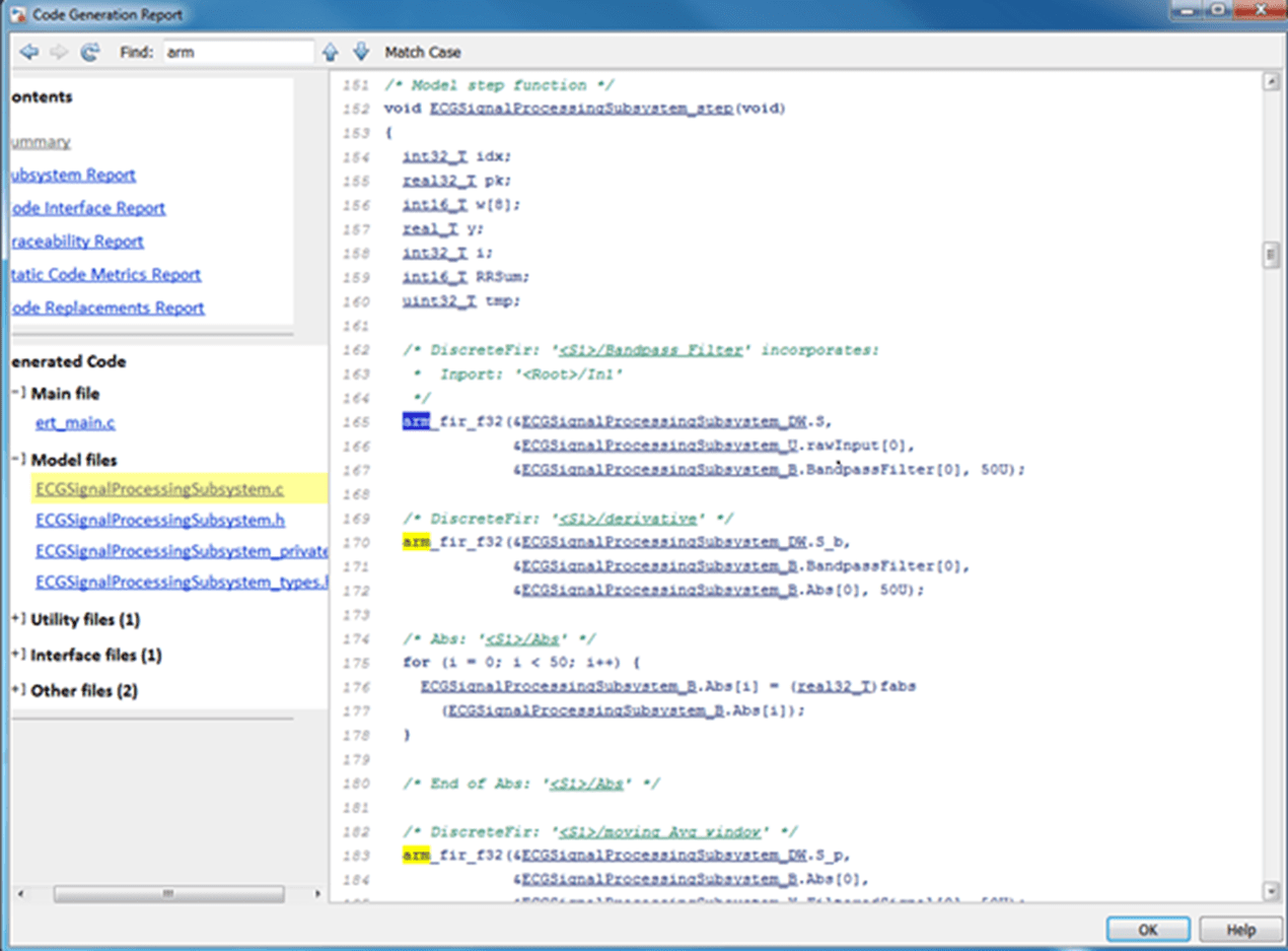 3. Build the Referenced Model to examine the generated code of the PIL block by clicking on the ECGSignalProcessingSubsystem.c file. Notice the multiple function calls, arm_fir_f32, in the generated C code.