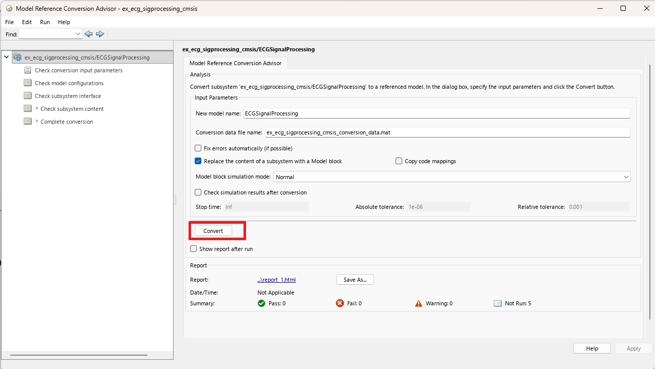 1. Open the ex_ecg_sigprocessing_cmsis.slx model.