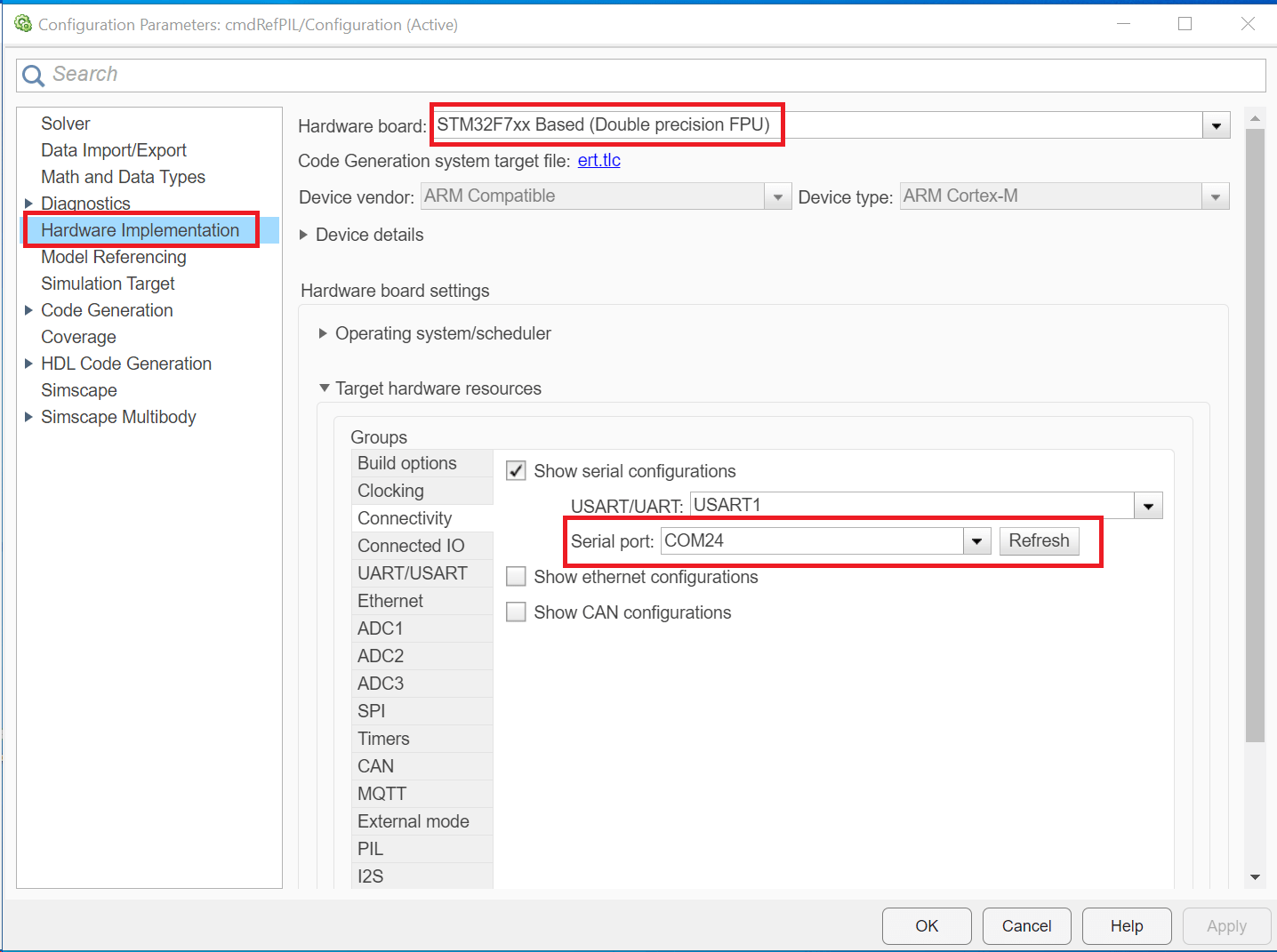 Set the Hardware board parameter to STM32F7xx Based (Double precision FPU). Under Hardware board settings, navigate to Target hardware resources and enter the serial port number to which your ARM Cortex-M hardware is connected.