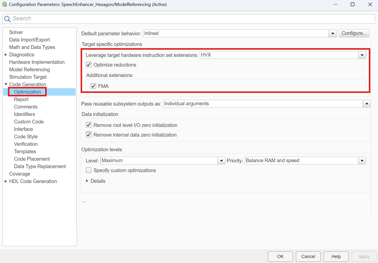 targetInfo = get_param("SpeechEnhancer_Hexagon","CoderTargetData"); targetInfo.Device.EnableHVX = 1; targetInfo.Device.ProcessorVersion = 'V75'; set_param("SpeechEnhancer_Hexagon","CoderTargetData",targetInfo); set_param("SpeechEnhancer_Hexagon","InstructionSetExtensions", "HVX"); set_param("SpeechEnhancer_Hexagon","OptimizeReductions","On"); set_param("SpeechEnhancer_Hexagon","InstructionSetFMA","On"); set_param("SpeechEnhancer_Hexagon","CodeReplacementLibrary","Qualcomm Hexagon HVX, Qualcomm Hexagon QHL");