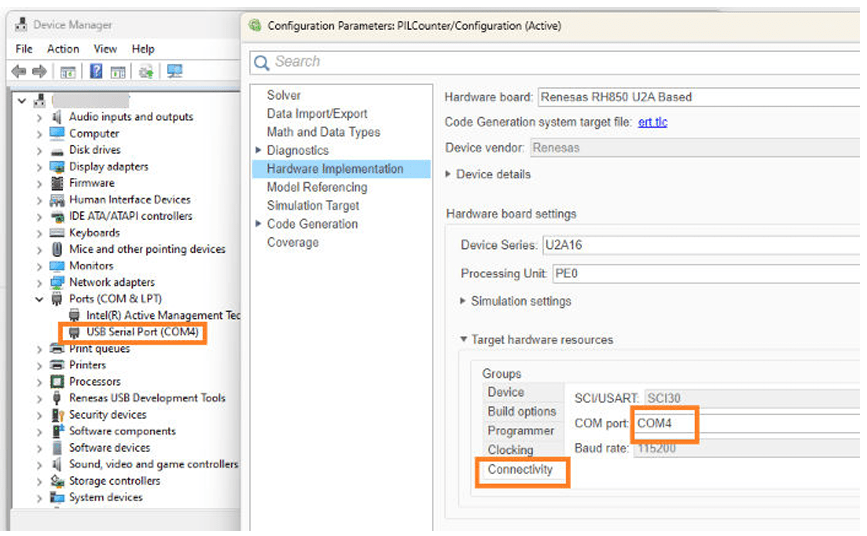 4. Navigate to Target hardware resources > Connectivity and enter the COM Port number. To find the COM port number, check the Device Manager on your PC.
