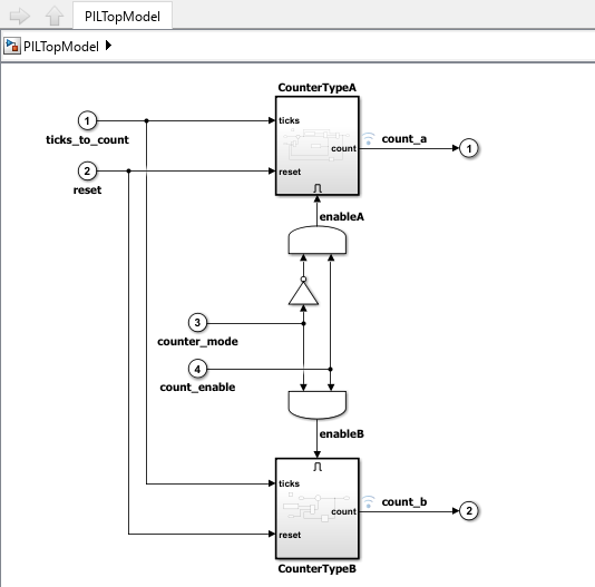 1. Open the example model that has two Model blocks which reference the same model. In a simulation, you run one Model block in PIL mode and the other Model block in normal mode.