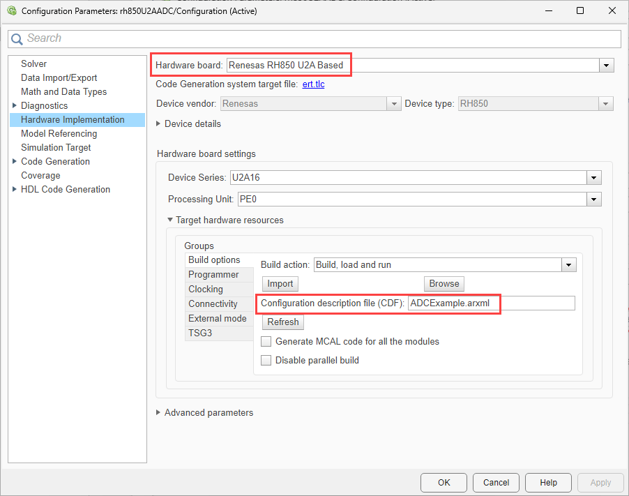 ADCExample.arxmlis added as the configuration description file in Build options. To verify click Modeling > Model Settings to open the Configuration Parameters dialog box. Navigate to Hardware Implementation > Target hardware resources > Build options.