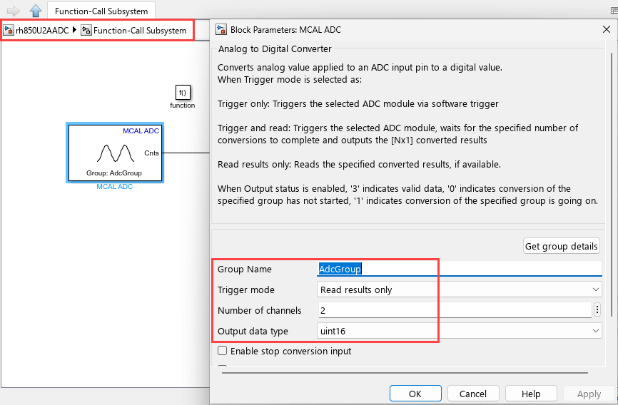 Double click the MCAL ADC block to open the block parameters dialog.