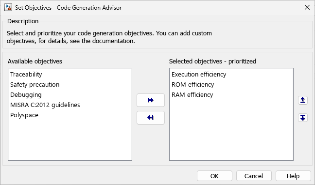 2. For this example, select the code generation objectives Execution efficiency, ROM efficiency, and RAM efficiency.