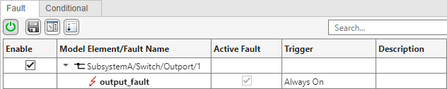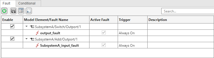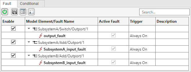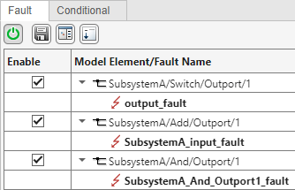 The fault information file of the parent model, subsystemRef1_faultInfo, stores information from the faults in the parent model and the subsystem. The Fault Table pane indicates whether the faults originate in the referenced subsystem or the top model. Open the Fault Table pane and expand the model elements to view the faults.