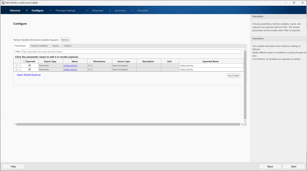 Click Next to move to the Configure page. You can select tunable parameters and internal variables that you want to export on this page. Click the Refresh button to get the latest variable information from the model. In the Parameters tab, select the check box for the parameters you want to export and optionally specify their exported name. In the Internal Variables tab, select the check box for the internal variables you want to export and optionally specify their exported name. You can check the FMU input and output specification in the Input and Output tabs.