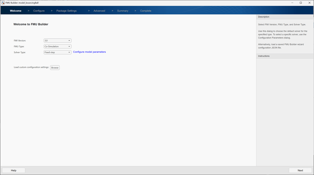 On the Welcome page, specify the FMI Version and FMU Type. You can also change the solver setting.