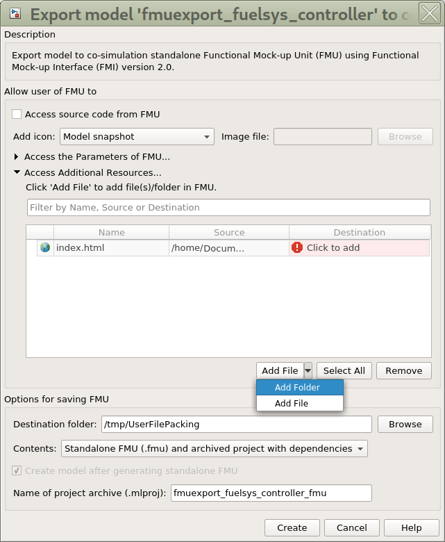 % Export model to Standalone Co-Simulation FMU 3.0 with user specified % file exportToFMU('fmuexport_fuelsys_controller','FMIVersion','3.0','FMUType','CS','Package',{'documentation',{fullfile(pwd,'DocumentFiles','index.html'),fullfile(pwd,'DocumentFiles','images')}},'ExportedContent','project');