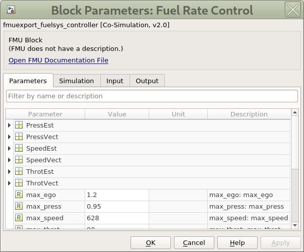 In the fmuexport_fuelsys_top, you can open the documentation file packed in the FMU by launching the block dialog box for Fuel Rate Control and clicking Open FMU Documentation File.