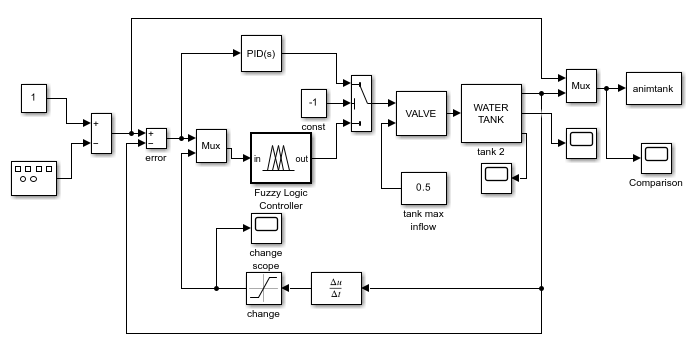 Open the Simulink model. For this example, use the sltank model, which uses a FIS to control the water level in a tank.