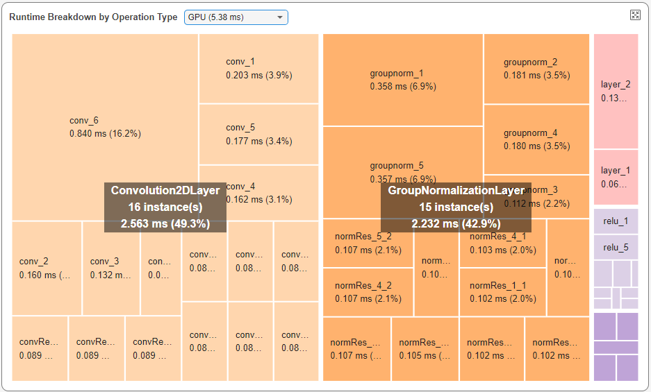 Use the Select a device list to view the layer performance on the CPU or the GPU. The breakdown highlights 2-D convolution layers as the operation type that takes the longest time. For example, this image shows a network where 2-D convolution layers took the most time on the GPU followed by group normalization layers.