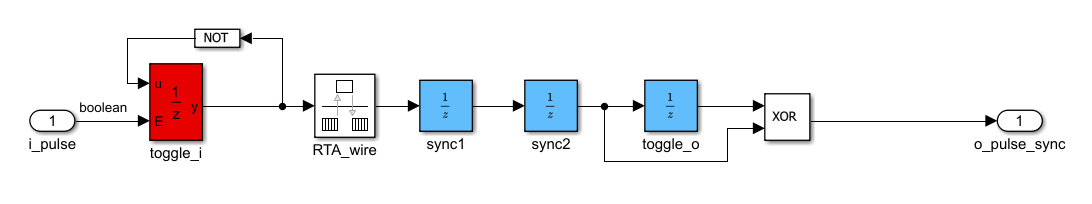 The output of the toggle_i Unit Delay Enabled Synchronous block toggles from high to low and then low to high every time an input pulse arrives from the i_pulse Inport block. The output of the toggle_i block is a level signal that the subsystem can synchronize to the destination clock domain by using two flip-flop synchronizers, represented by the sync1 and sync2 Unit Delay blocks. The sync2 block has two output signals, one that connects directly to the XOR block, and one that connects to the XOR block after being delayed one clock cycle by the toggle_o Unit Delay block.