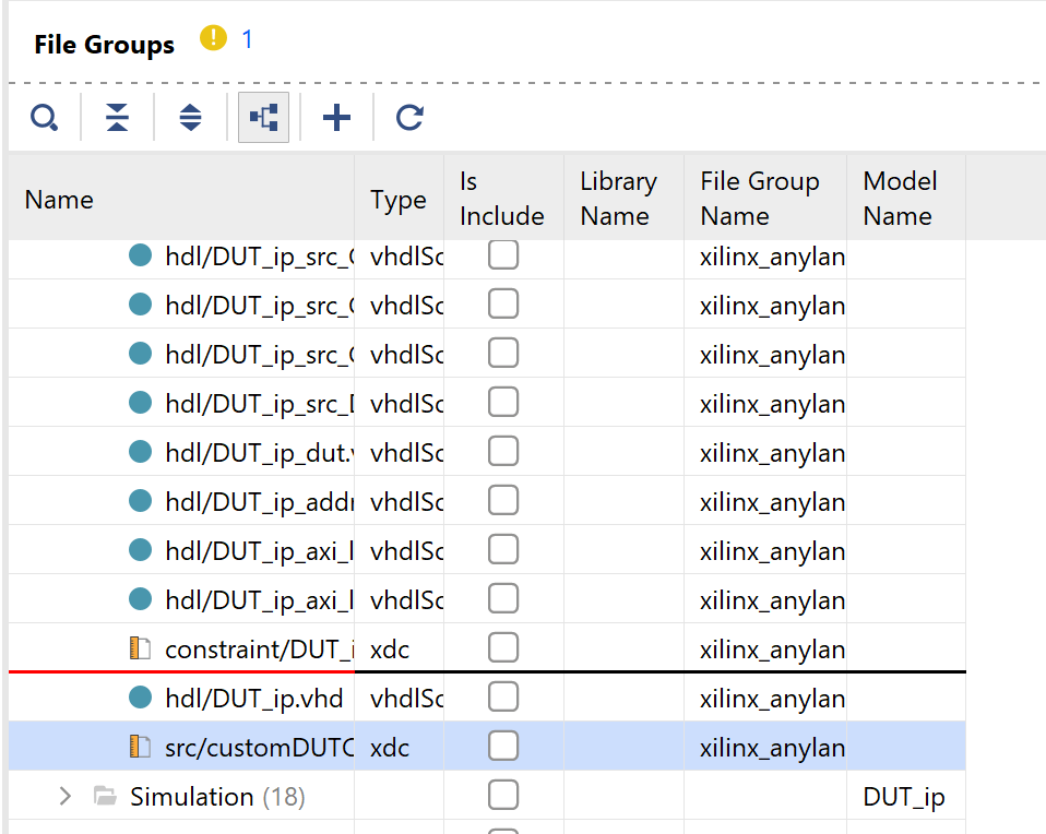 3. Click File Groups to see the design sources in the IP core. Vivado displays design sources, including the autogenerated timing constraint file DUT_ip_hdlc_CDC_constraint.xdc for the multi-clock IP core. HDL Coder generates the constraints during IP core generation including constraints that synchronize the DUT enables and IP core resets in each clock domain. To add the custom constraint for the logic in the DUT, in the File Groups pane, right click Synthesis and then click Add Files.