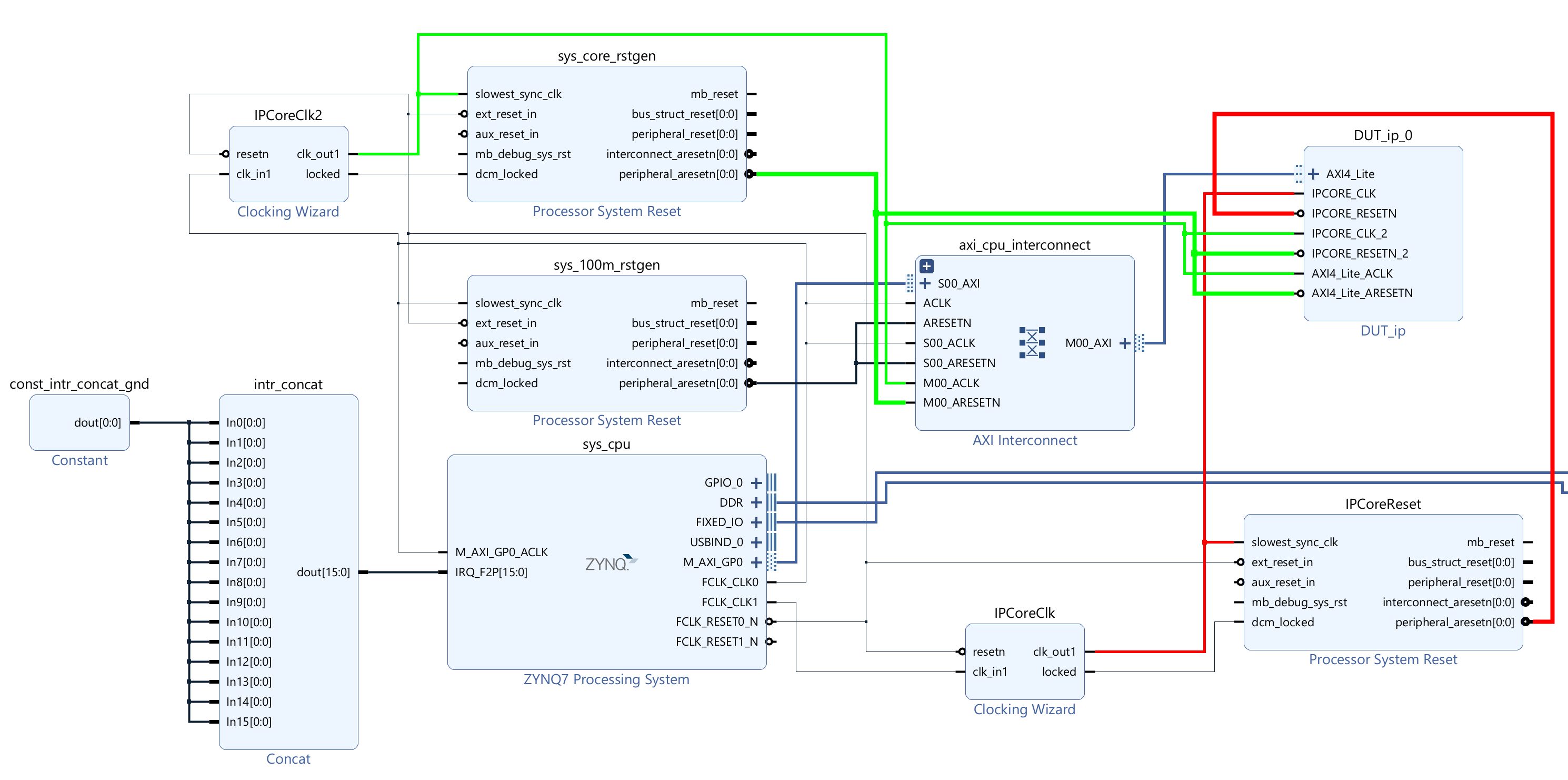 3. The example targets a ZedBoard with two PLL clocks: FCLK_CLK0 at 100 MHz and FCLK_CLK1 at 200 MHz, each of which feeds a clock wizard that generates the required frequencies. For this example, they generate 50 MHz for IPCoreClk2 and 141.39785 MHz for IPCoreClk.