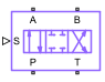 The 4-Way 3-Position Directional Valve (MA) block models a valve with four openings in a moist air network, typically between an actuator, pump, and tank. A single spool controls the valve operation according to the signal at port S. You can set the baseline configuration of your valve by specifying the orifices that are open when the spool is in the neutral position (centered at 0 m) in the Neutral spool position open connections parameter, when the spool moves in the positive direction in the Positive spool position open connections parameter, and when the spool moves in the negative direction in the Negative spool position open connections parameter. You can use the Orifice parameterization parameter to specify the valve model as a linear relationship or function of user-provided data.