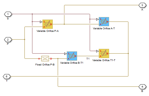 0corresponds to a zero-lapped valve. The default value is2.5e-3m.- Between ports T1 and T