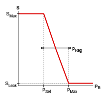 The figures show the opening characteristics of the valve. In the default valve parameterization, the opening area (S) drops linearly with the outlet pressure (pB) with its value ranging from a maximum in the fully open position (SMax) to a minimum in the fully closed position (SLeak). The drop occurs over a pressure range stretching from the valve pressure setting (pSet) to a maximum equal to the sum of the valve regulation range (pReg) and the valve pressure setting.