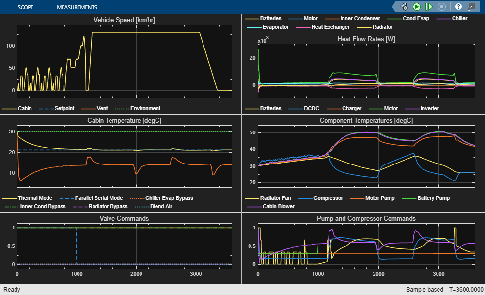 The following scope shows the vehicle speed, heat dissipation, cabin temperature, component temperatures, and control commands for the drive cycle scenario. For the Thermal Mode valve command: