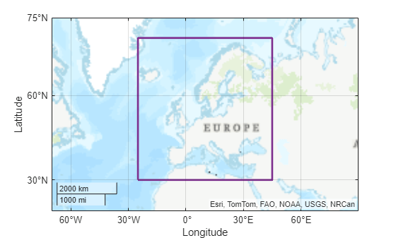 figure geobasemap topographic geoplot(aoiE,LineWidth=2,EdgeColor="#7E2F8E",FaceColor="none") geolimits([15 75],[-70 90])