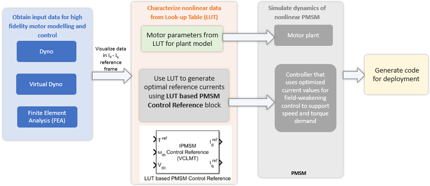 This figure shows the various methods of obtaining input data that characterize the motor and the process to generate the optimal reference currents for operating the motor with the lowest copper losses. Use these values in a motor system model, which can then further be deployed to a microcontroller through code generation workflow.