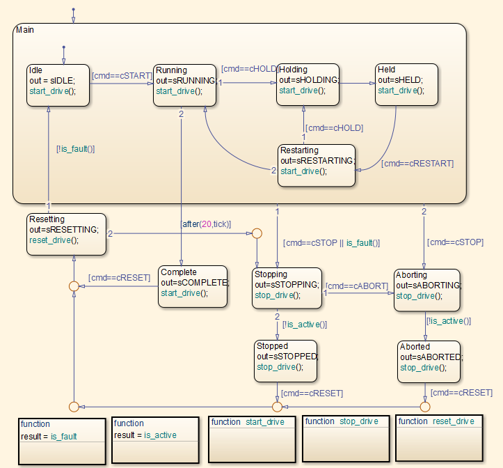 reset_drive in the generated code, see Control Code Partitions for MATLAB Functions in Stateflow Charts.