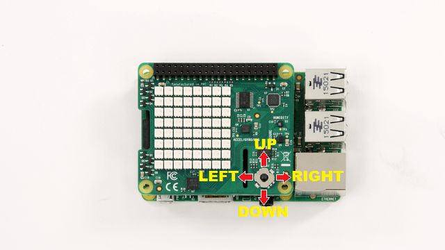 The numerical values representing joystick positions are ordered with respect to the reference position of the Sense HAT. The HDMI port of the Raspberry Pi board facing downwards is the reference position.