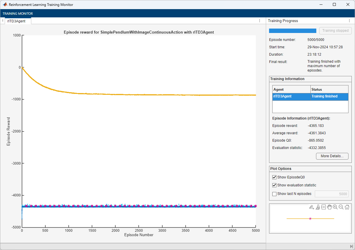 % Recreate the environment so it does not plot during training. env = rlPredefinedEnv("SimplePendulumWithImage-Continuous"); % Train the agent. Record the training time. tic ddpgTngRes = train(ddpgAgent,env,trainOpts,Evaluator=evl); ddpgTngTime = toc; % Extract the number of training episodes and the number of total steps. ddpgTngEps = ddpgTngRes.EpisodeIndex(end); ddpgTngSteps = sum(ddpgTngRes.TotalAgentSteps); % Uncomment to save the trained agent and the training metrics. % save("cpsuImgBchDDPGData.mat", ... % "ddpgAgent","ddpgTngEps","ddpgTngSteps","ddpgTngTime")