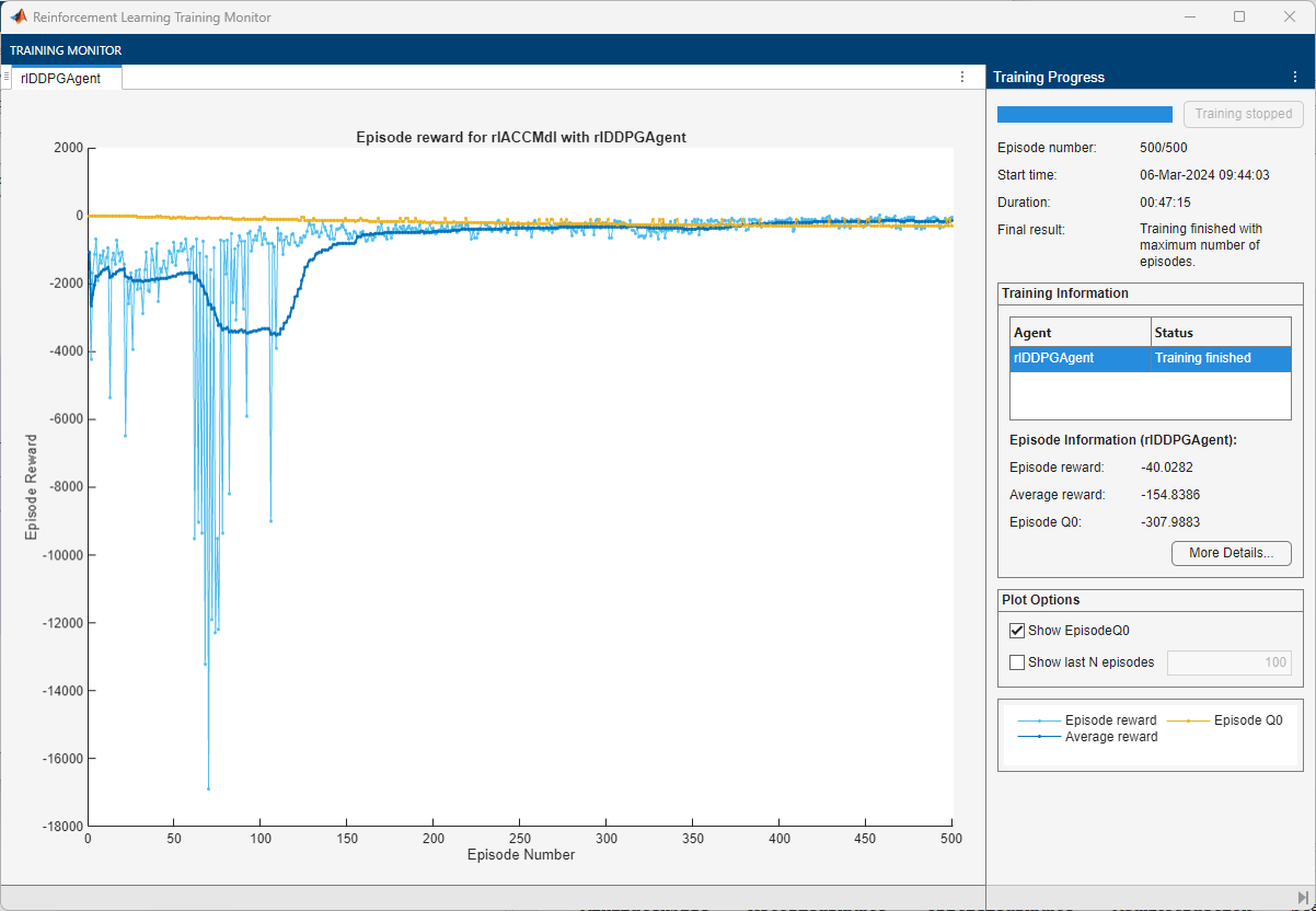 maxepisodes = 500; maxsteps = ceil(Tf/Ts); trainingOpts = rlTrainingOptions(... MaxEpisodes = maxepisodes,... MaxStepsPerEpisode = maxsteps,... Plots = "training-progress",... StopTrainingCriteria = "none");