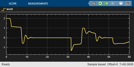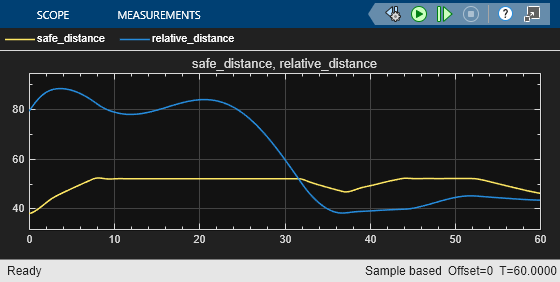 rng(0,"twister");To validate the performance of the trained agent deterministically, set the initial position of the lead car to 80 (m) and simulate the model. To validate the performance for a randomly chosen initial position, set useRandomInitialConditions to true.
