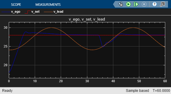 The reference velocity for the ego car is defined as follows. If the relative distance is less than the safe distance, the ego car tracks the minimum of the lead car velocity and driver-set velocity. In this manner, the ego car maintains some distance from the lead car. If the relative distance is greater than the safe distance, the ego car tracks the driver-set velocity. In this example, the safe distance is defined as a linear function of the ego car longitudinal velocity , that is, . The safe distance determines the tracking velocity for the ego car.
