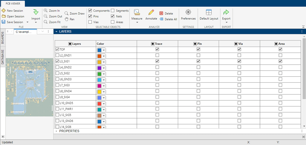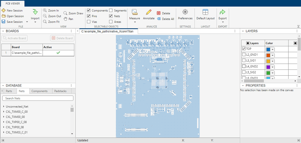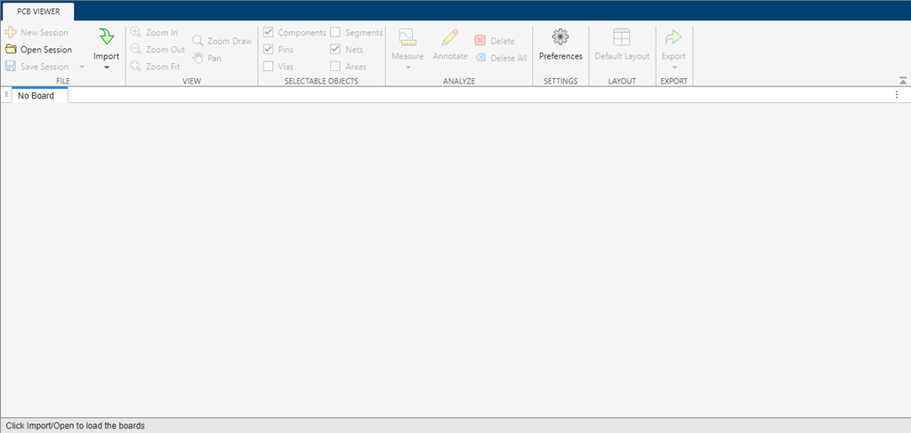 Launch the PCB Viewer App and then import a PCB database file, or open a previously saved PCB Viewer session.