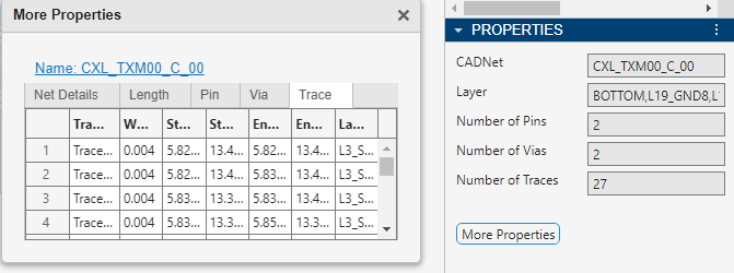 Inspect the properties of individual PCB objects by either clicking on the object in the layout, or by selecting the object in the database lists.
